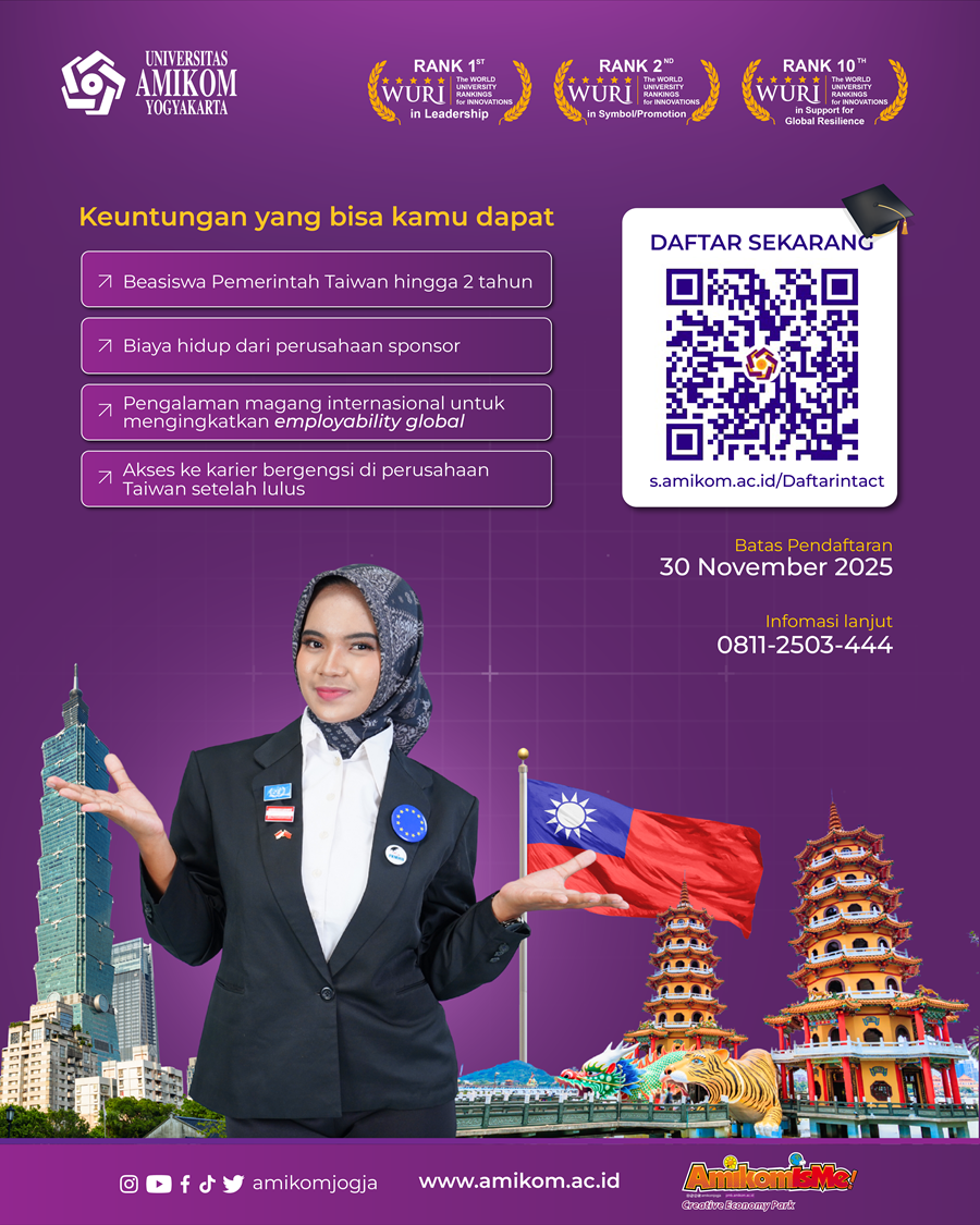 Universitas AMIKOM Yogyakarta resmi menjalin kerja sama (MoU) dengan beberapa universitas ternama di Taiwan. Melalui Taiwan Intense Program – Spring 2026 Intake, mahasiswa D3 dan S1 AMIKOM kini punya kesempatan besar untuk melanjutkan studi dan magang internasional di Taiwan.